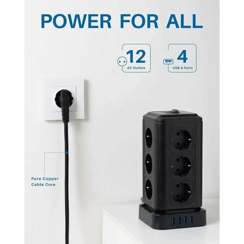 Более того, он имеет влаго- и пылезащиту IP20, а также каждая розетка для вилок заземлена и имеет защитные шторки от детей. Автоматический предохранитель, встроенный в выключатель обеспечивает защиту от перегрузки и короткого замыкания, а качественный негорючий ABS-пластик корпуса высокой степени огнеупорности гарантирует защиту от пожара. Oснащение и технические характеристики Удлинитель сетевой вертикальный типа "башня" с 12-ю розетками, 4-мя USB гнездами (УСБ) для зарядки портативных устройств. Особенно usb удлинитель актуален, когда в помещении, в квартире, в доме или на даче мало источников подключения - можно из одной розетки сделать 12 и при этом ещё заряжать 4 устройства одновременно через USB (ЮСБ) сокет.