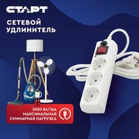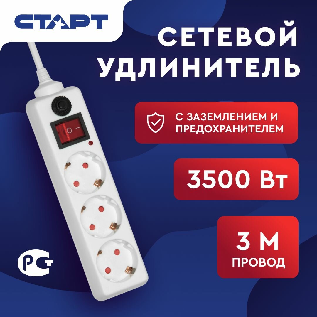 Купить Сетевой фильтр с предохранителем 3м 3 розетки старт удлинитель бытовой с заземлением, защита от перегрузки и короткого замыкания с доставкой по всей России.