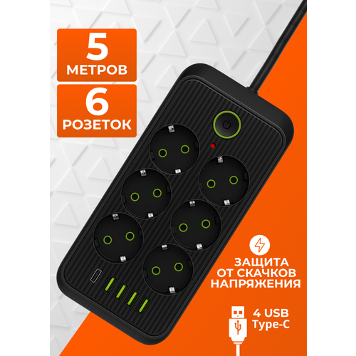Сетевой фильтр 5 метров с 6 розетками 4 USB +1 Type-C (удлинитель, пилот, тройник), с предохранителем и заземлением: сравнение цен, характеристики, фото, актуальное наличие и цены.