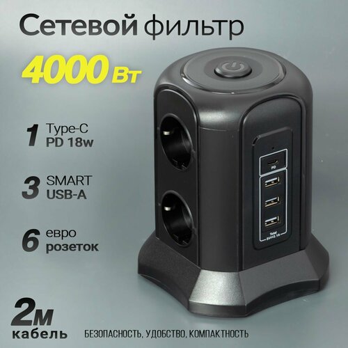 Сетевой фильтр башенного типа с многоступенчатой защитой и разъемами USB и Type-C решит проблему недостаточного количества розеток.