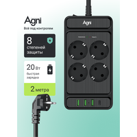 Сетевой фильтр, AGNI, 4 розетки + 3 USB и 1 TYPE-C, удлинитель 2м, с предохранителем