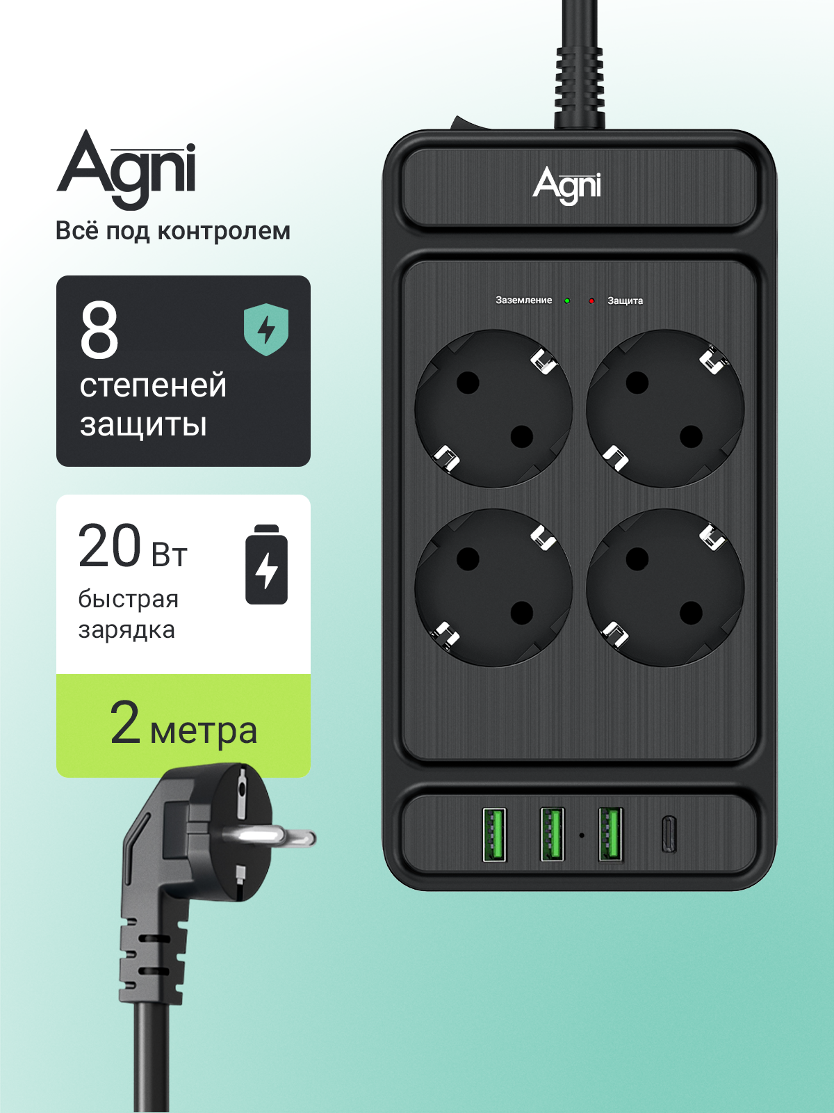 Сетевой фильтр, AGNI, 4 розетки + 3 USB и 1 TYPE-C, удлинитель 2м, с предохранителем: сравнение цен, характеристики, фото, актуальное наличие и цены.