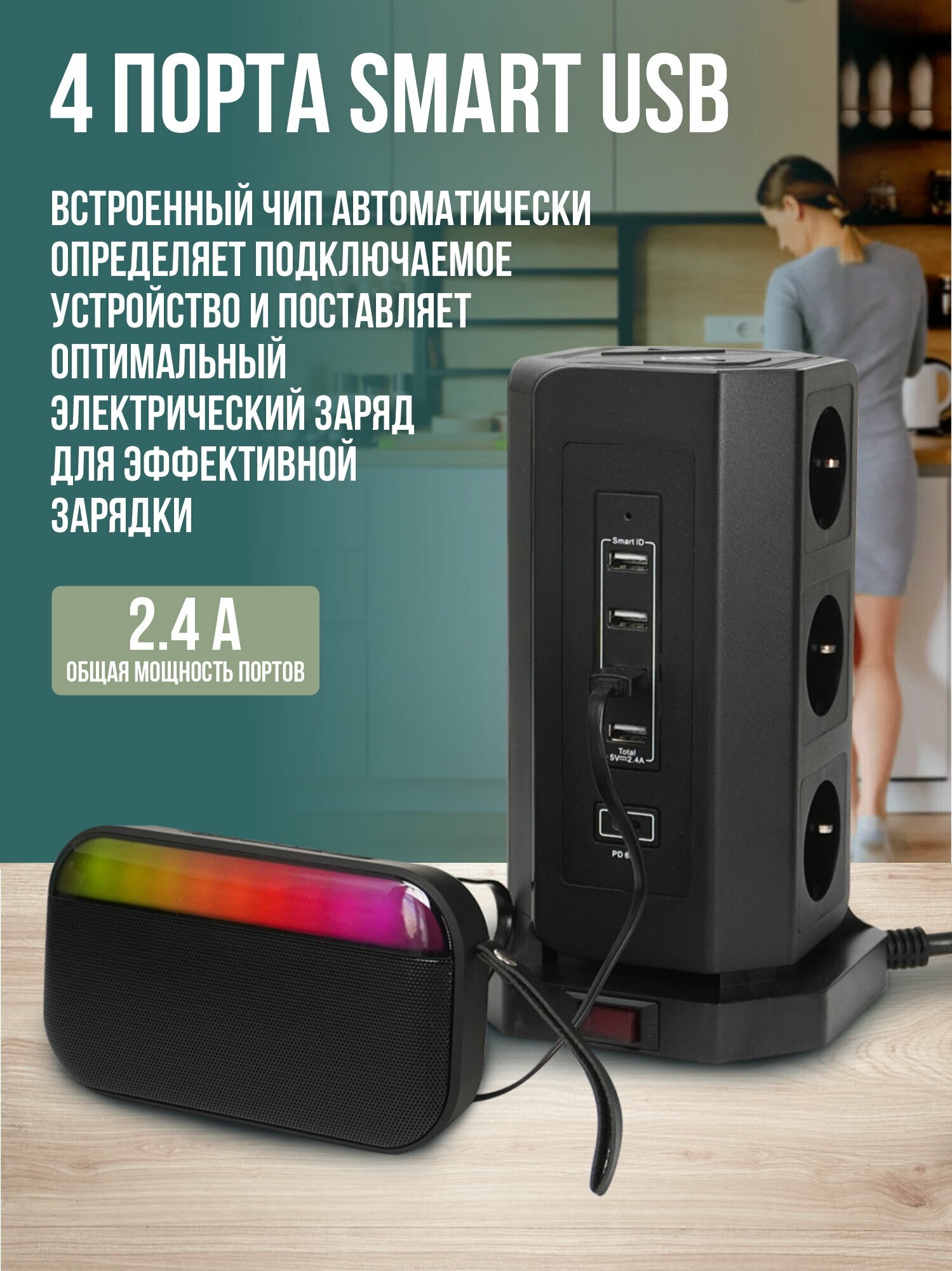 Удлинитель электрический башенного типа с USB и Type-C (с супер быстрой зарядкой 65 Вт)- это незаменимый аксессуар для дома, дачи, квартиры и офиса, который позволяет решить проблему недостаточного количества розеток в любом помещении и подключить большое количество бытовой и офисной техники, техники для кухни, гирлянд на праздники и так далее, а также зарядки телефонов и других гаджетов за счёт того, что в нем имеются не только розетки, но и usb разъемы. Модный и стильный дизайн бытового сетевого фильтра с выключателем бренда AGNI оснащен оптимальным сочетанием разъемов: 9-ю розетками для вилок евростандарт (тип F) и 4-мя ЮСБ Type-A гнездами и 1 Type-C, поддерживающим быструю зарядку, поэтому он станет вашим незаменимым помощником.