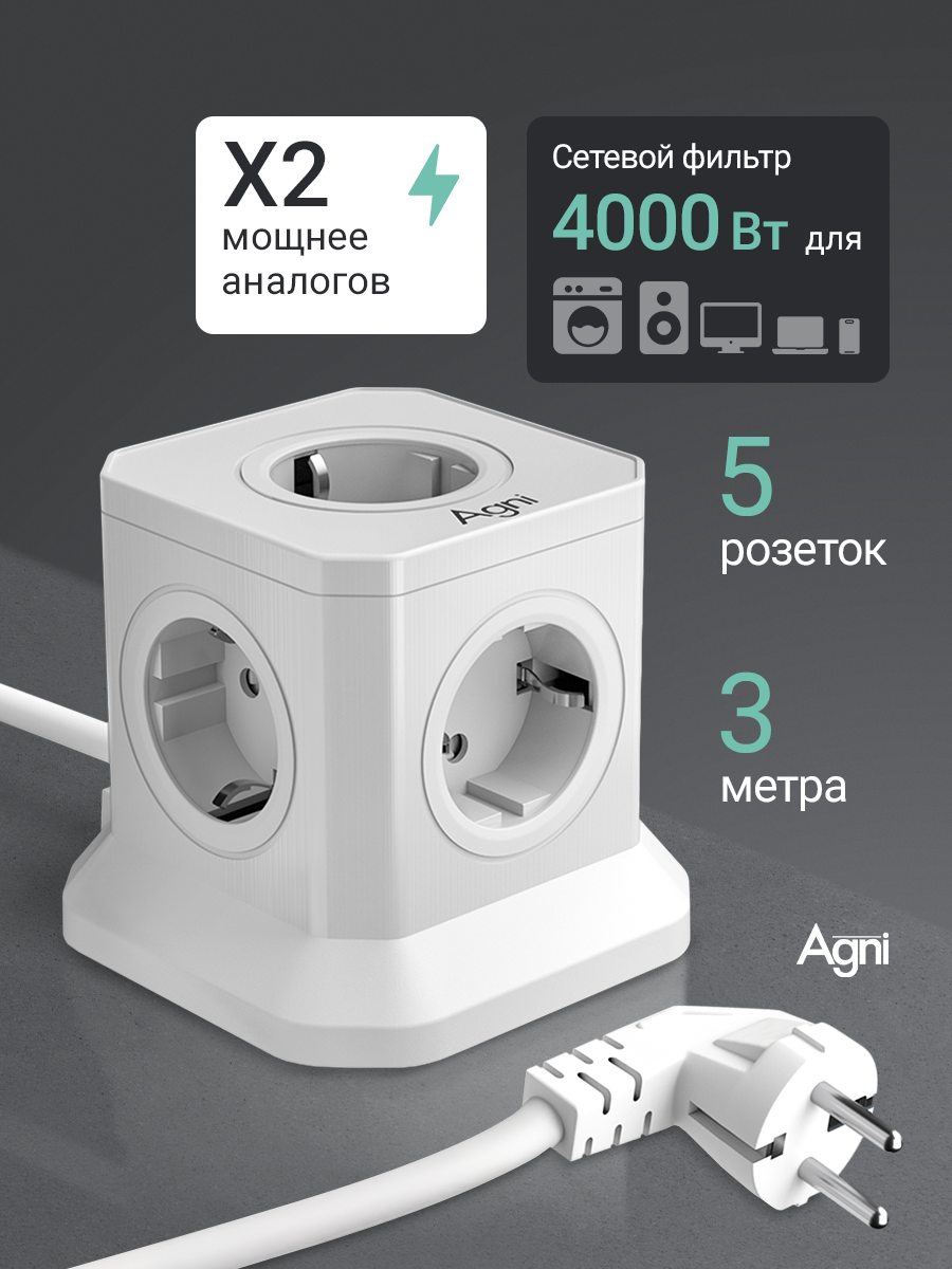 Сетевой фильтр, AGNI, 5 розеток, с предохранителем и заземлением, кабель 3м, белый: сравнение цен, характеристики, фото, актуальное наличие и цены.