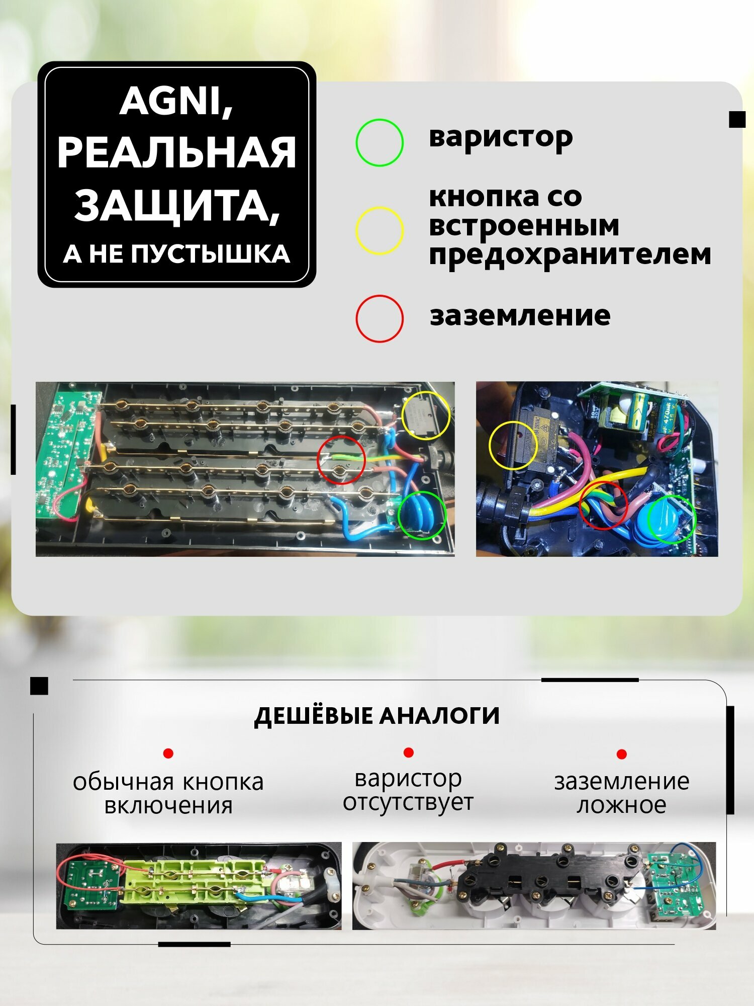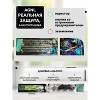 Сетевые фильтры AGNI спроектированы с многоступенчатой системой защиты, обеспечивающей безопасность подключённого оборудования и пользователя. Каждый уровень работает в своей зоне ответственности — от защиты от импульсного перенапряжения до предотвращения возгорания.