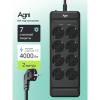 Сетевой фильтр, AGNI, 8 розеток, с предохранителем и заземлением, удлинитель сетевой 2м
