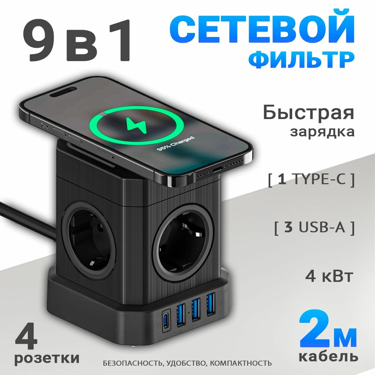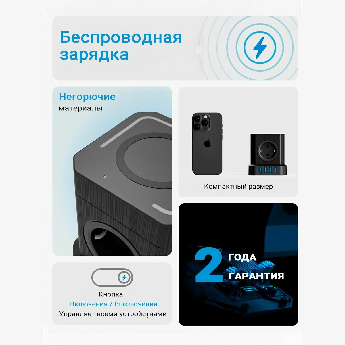 Сетевой фильтр башенного типа с беспроводной зарядкой, многоступенчатой защитой и разъемами USB и Type-C решит проблему недостаточного количества розеток.