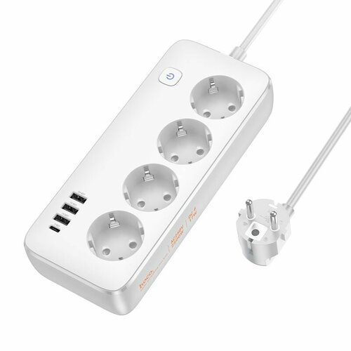 Этот сетевой фильтр от компании HOCO представляет собой универсальное и функциональное устройство для защиты вашей электроники от скачков напряжения и обеспечения удобного доступа к электричеству. Он оснащён четырьмя розетками, тремя портами USB и одним портом PD (Power Delivery), что позволяет одновременно подключать различные устройства, включая смартфоны, планшеты и другие электронные приборы.