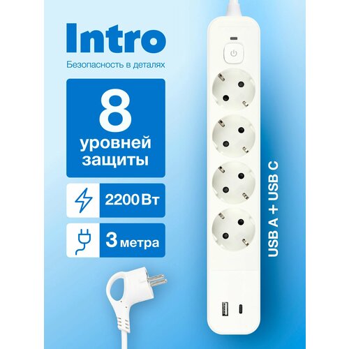 Купить Сетевой фильтр Intro SFE430-2xUSBAC-W с базовой защитой с заземлением с выключателем 4 розетки+2xUSBA+C 3,1A 3м 10А с доставкой по всей России. Сетевой фильтр Intro SFE430-2xUSBAC-W с базовой защитой с заземлением с выключателем 4 розетки+2xUSBA+C 3,1A 3м 10А: сравнение цен, характеристики, фото, актуальное наличие и цены.