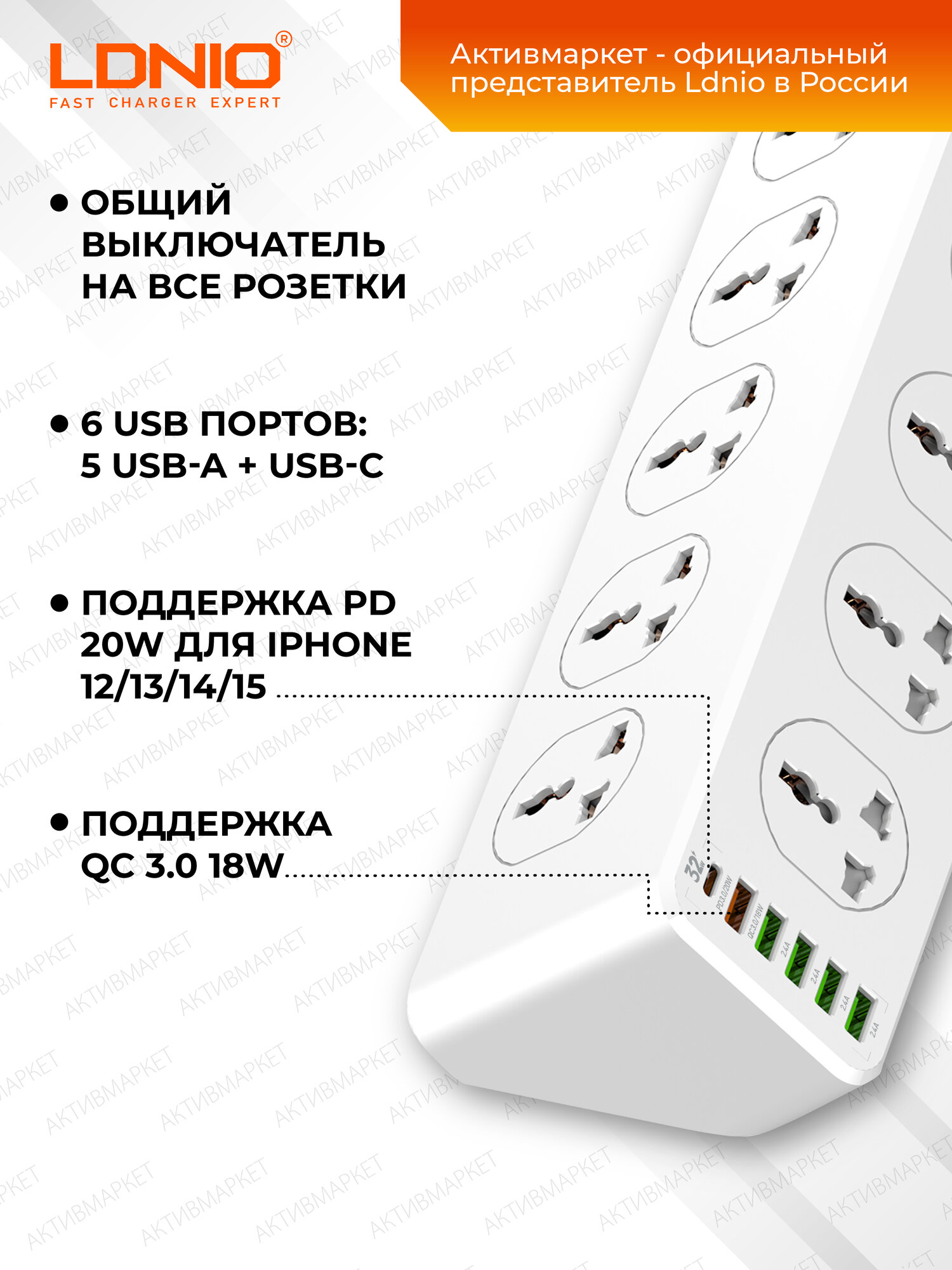 С сетевым фильтром LDNIO SC10610 нет смысла покупать зарядные устройства для смартфонов и планшетов. Шесть разъёмов USB пополнят энергией большинство мобильных гаджетов, включая беспроводные колонки, внешние аккумуляторы и светодиодные фонари