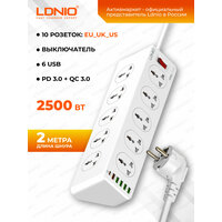 LDNIO SC10610 - двухметровый удлинитель - электрический разветвитель на десять розеток 220В, дополненный пятью портами USB-A и одним Type-C