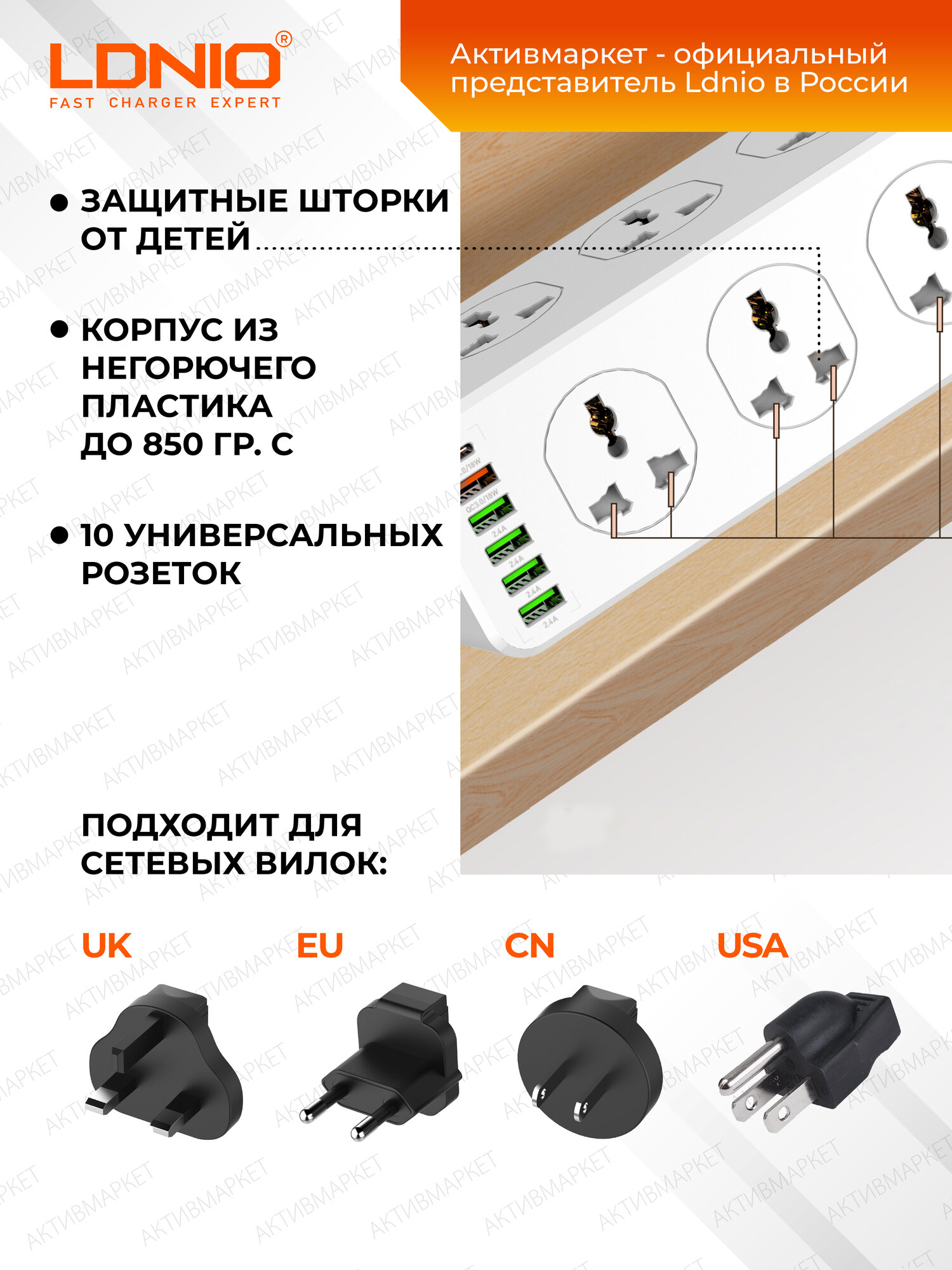 Главная особенность розеток переменного тока на сетевом фильтре LDNIO SC10610 - это универсальность. В них можно вставлять европейские, китайские, американские, английские силовые вилки