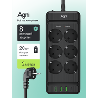 Сетевой фильтр на 6 розеток AGNI 3 USB и 1 TYPE-C, удлинитель 2м, защитные шторки, с предохранителем: сравнение цен, характеристики, фото, актуальное наличие и цены.