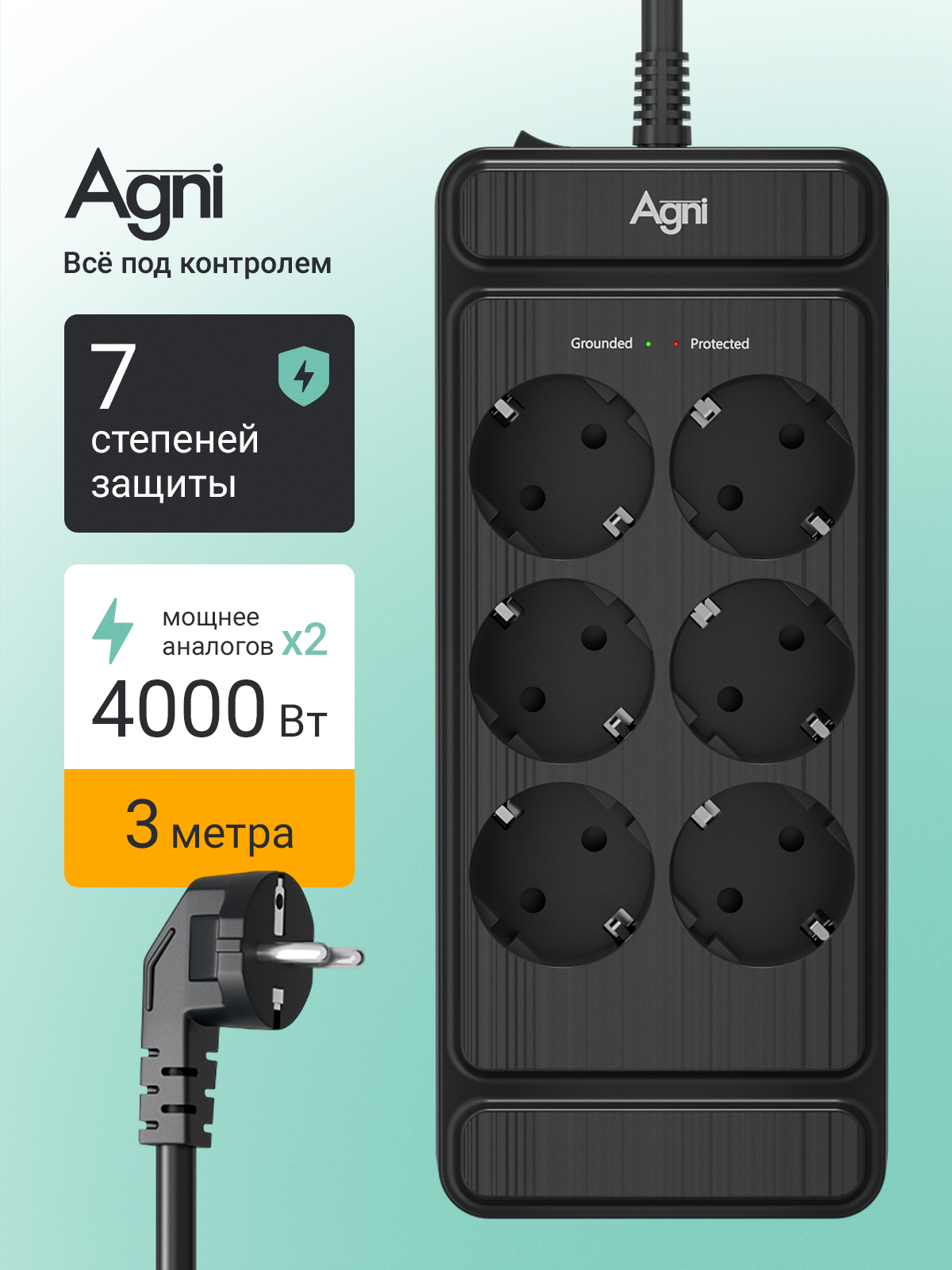 Купить Сетевой фильтр на 6 розеток AGNI с предохранителем и заземлением, кабель 3м с доставкой по всей России.