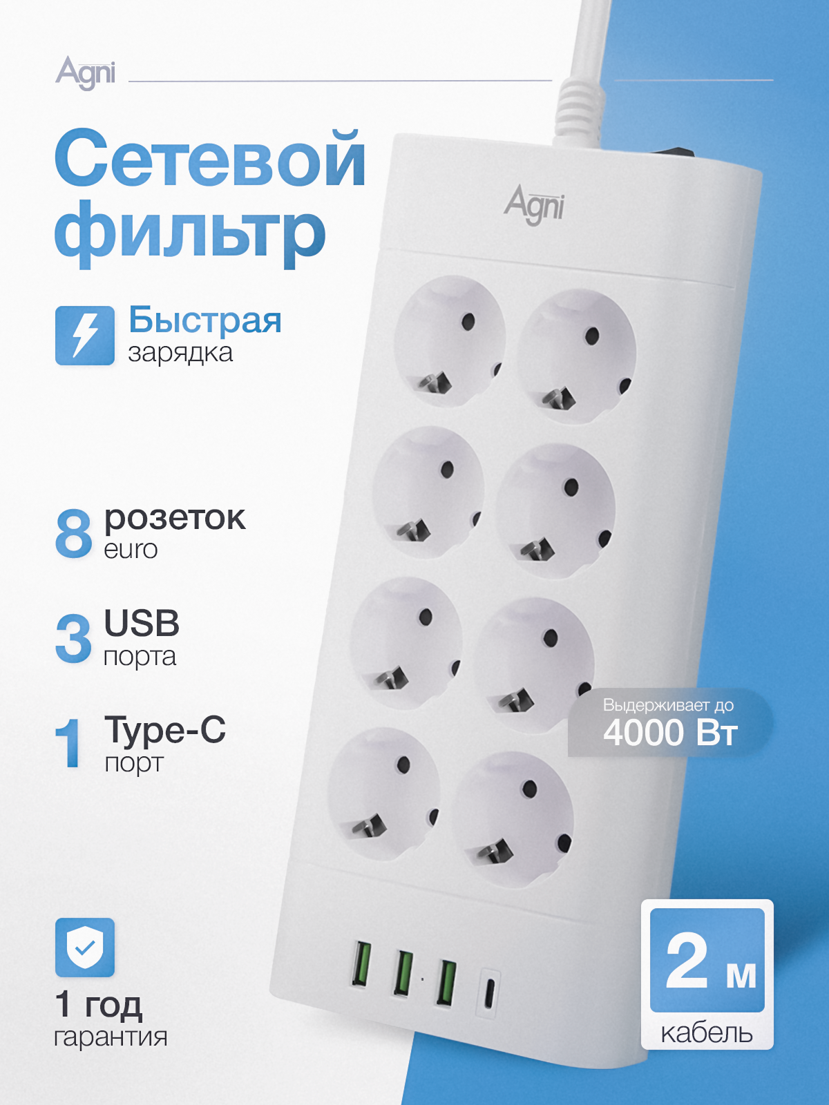 Сетевой фильтр с предохранителем, AGNI, 8 розеток / 3 USB / 1 TYPE-C, удлинитель 2 м, защитные шторки, негорючий пластик: сравнение цен, характеристики, фото, актуальное наличие и цены.