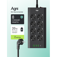 Сетевой фильтр с предохранителем, AGNI, 8 розеток / 3 USB / 1 Туре-С, удлинитель 2 м, защитные шторки, негорючий пластик: сравнение цен, характеристики, фото, актуальное наличие и цены.