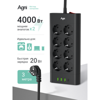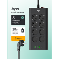 Сетевой фильтр с предохранителем, AGNI, 8 розеток / 3 USB / 1 TYPE-C, удлинитель 3 м, защитные шторки, негорючий пластик: сравнение цен, характеристики, фото, актуальное наличие и цены.