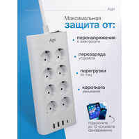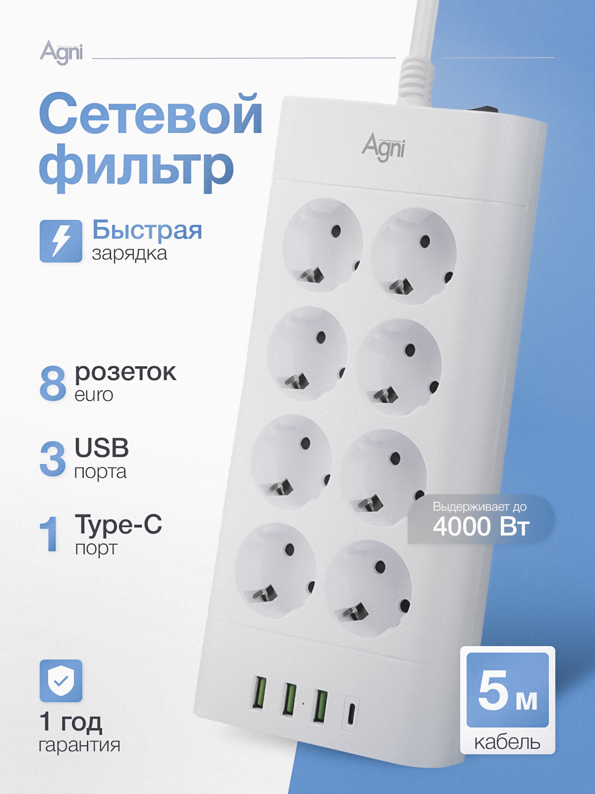 Сетевой фильтр с предохранителем, AGNI, 8 розеток / 3 USB / 1 TYPE-C, удлинитель 5 м, защитные шторки, негорючий пластик: сравнение цен, характеристики, фото, актуальное наличие и цены.