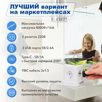 Сетевой фильтр с заземлением AGNI 5 розеток 220V, 3 USB 2.4A, 1 TYPE-C 20W (быстрая зарядка), 16A / 4000Вт 2м белый