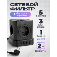 Сетевой фильтр с заземлением AGNI 5 розеток 220V, 3 USB 2.4A, 1 TYPE-C 20W (быстрая зарядка), 16A / 4000Вт 2м черный