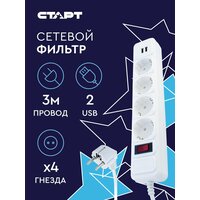 Сетевой фильтр с USB (2.1А) и предохранителем 3м 4 розетки старт удлинитель бытовой с заземлением, защита от перегрузки и короткого замыкания: сравнение цен, характеристики, фото, актуальное наличие и цены.