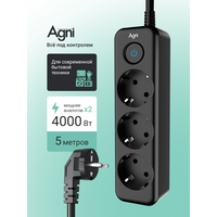 Сетевой фильтр с заземлением на 3 розетки AGNI с выключателем, защитные шторки, 4000 Вт/16 А, удлинитель 5 метров