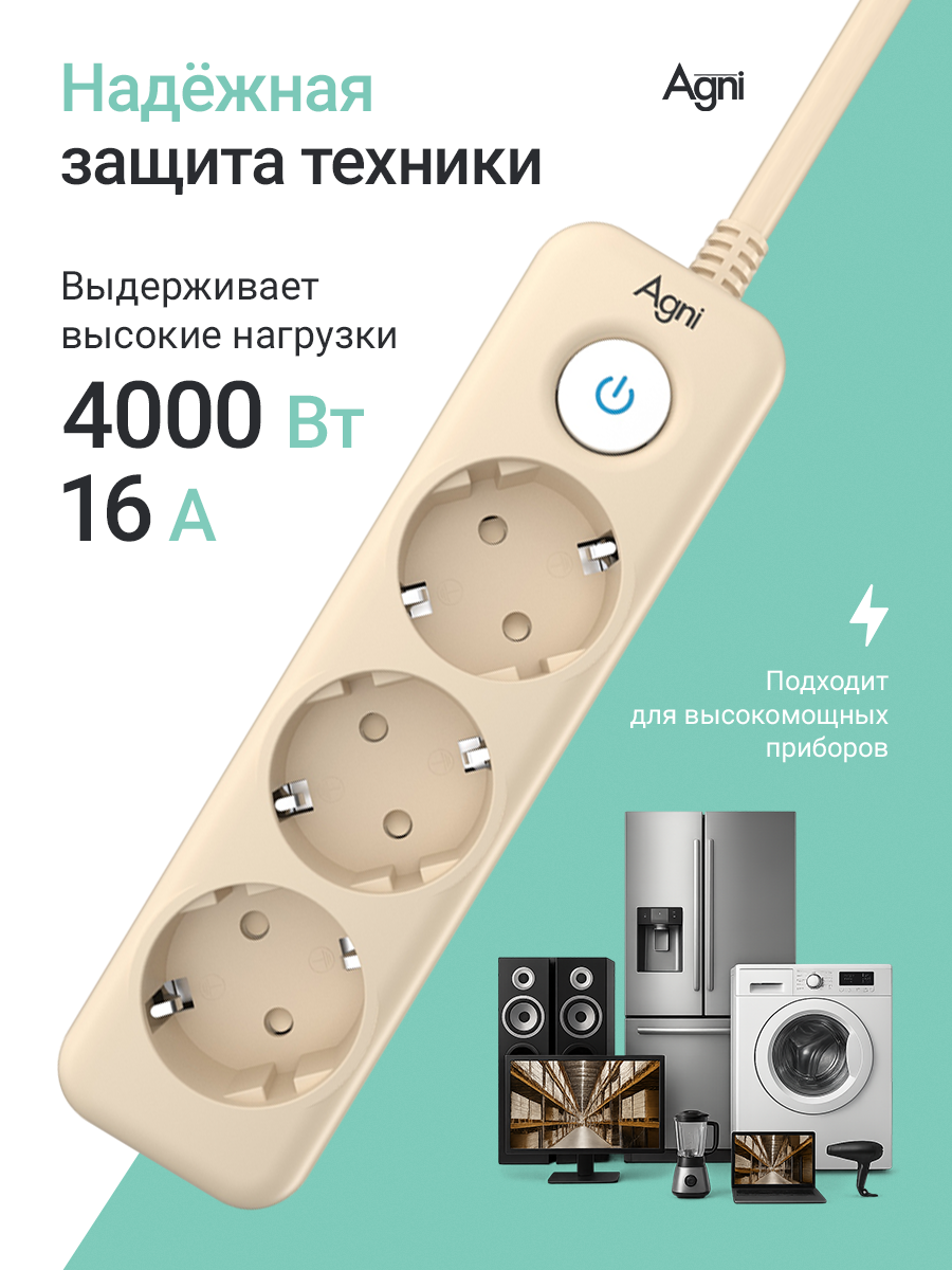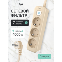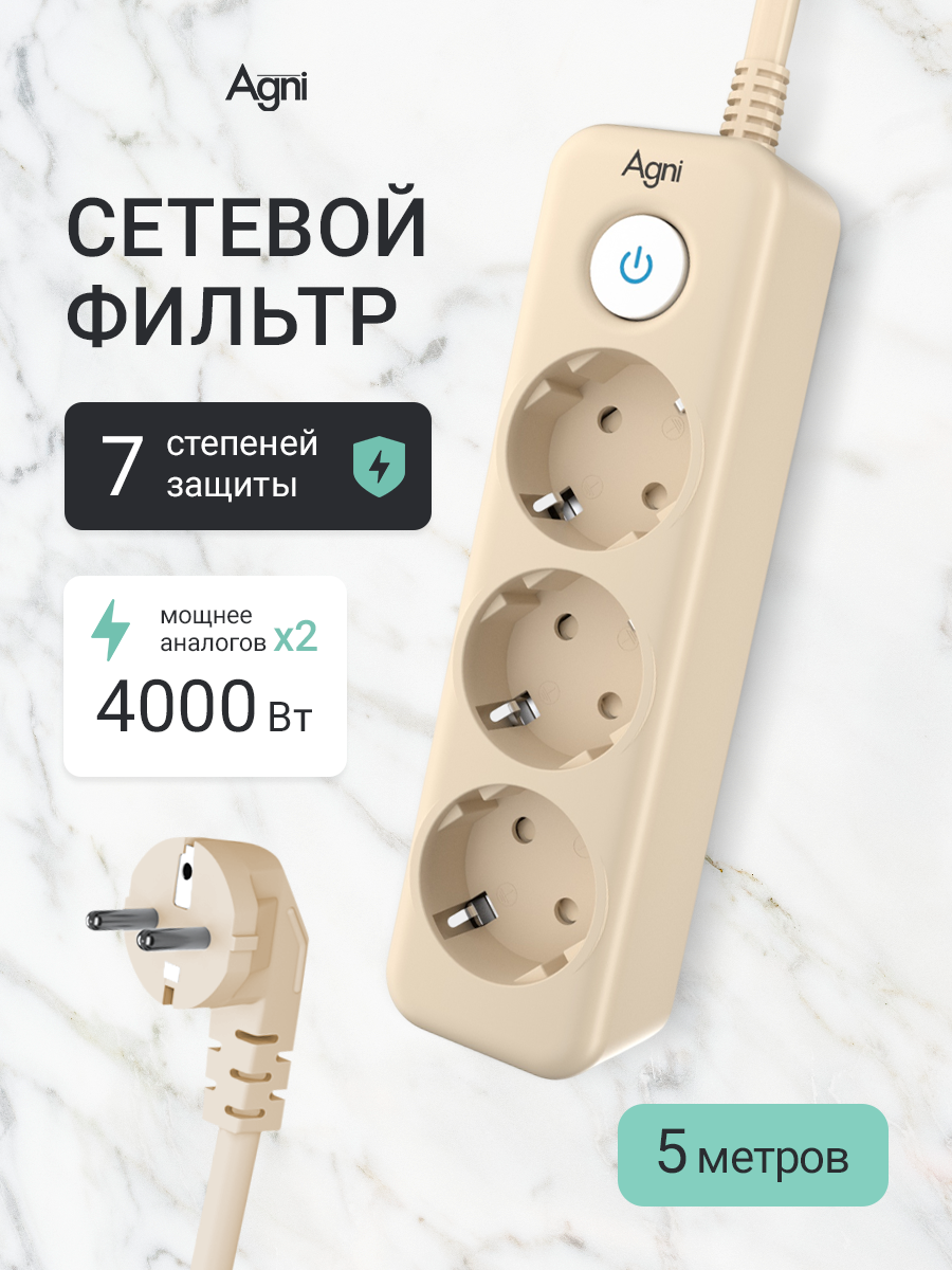 Сетевой фильтр с заземлением на 3 розетки AGNI с выключателем, защитные шторки, 4000 Вт/16 А, удлинитель 5 метров: сравнение цен, характеристики, фото, актуальное наличие и цены.