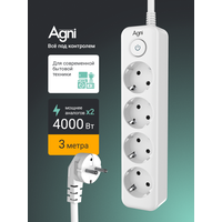 Сетевой фильтр с заземлением на 4 розетки AGNI с выключателем, защитные шторки, 4000 Вт/16 А, удлинитель 3 метра, белый