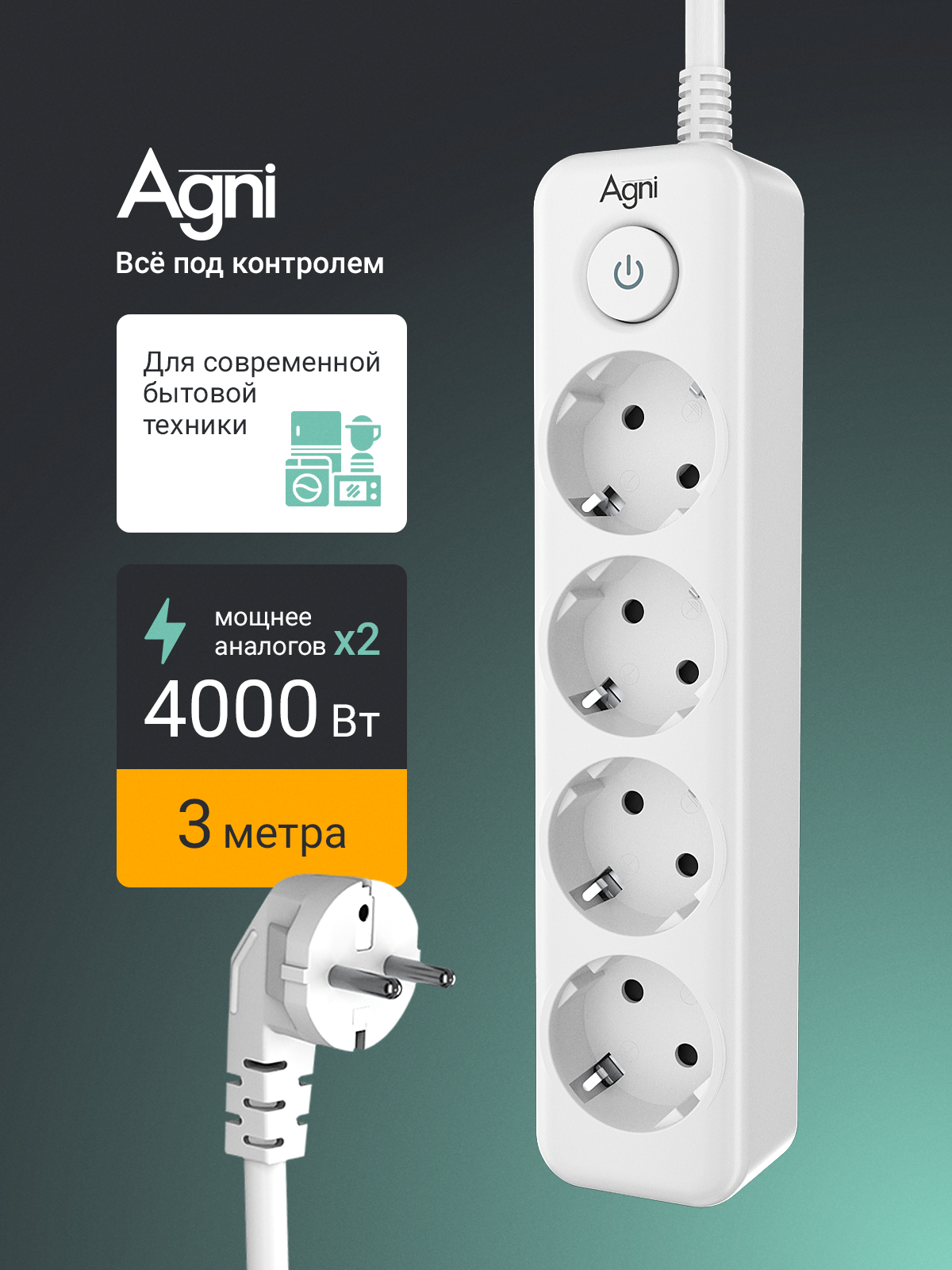 Сетевой фильтр с заземлением на 4 розетки AGNI с выключателем, защитные шторки, 4000 Вт/16 А, удлинитель 3 метра, белый: сравнение цен, характеристики, фото, актуальное наличие и цены.