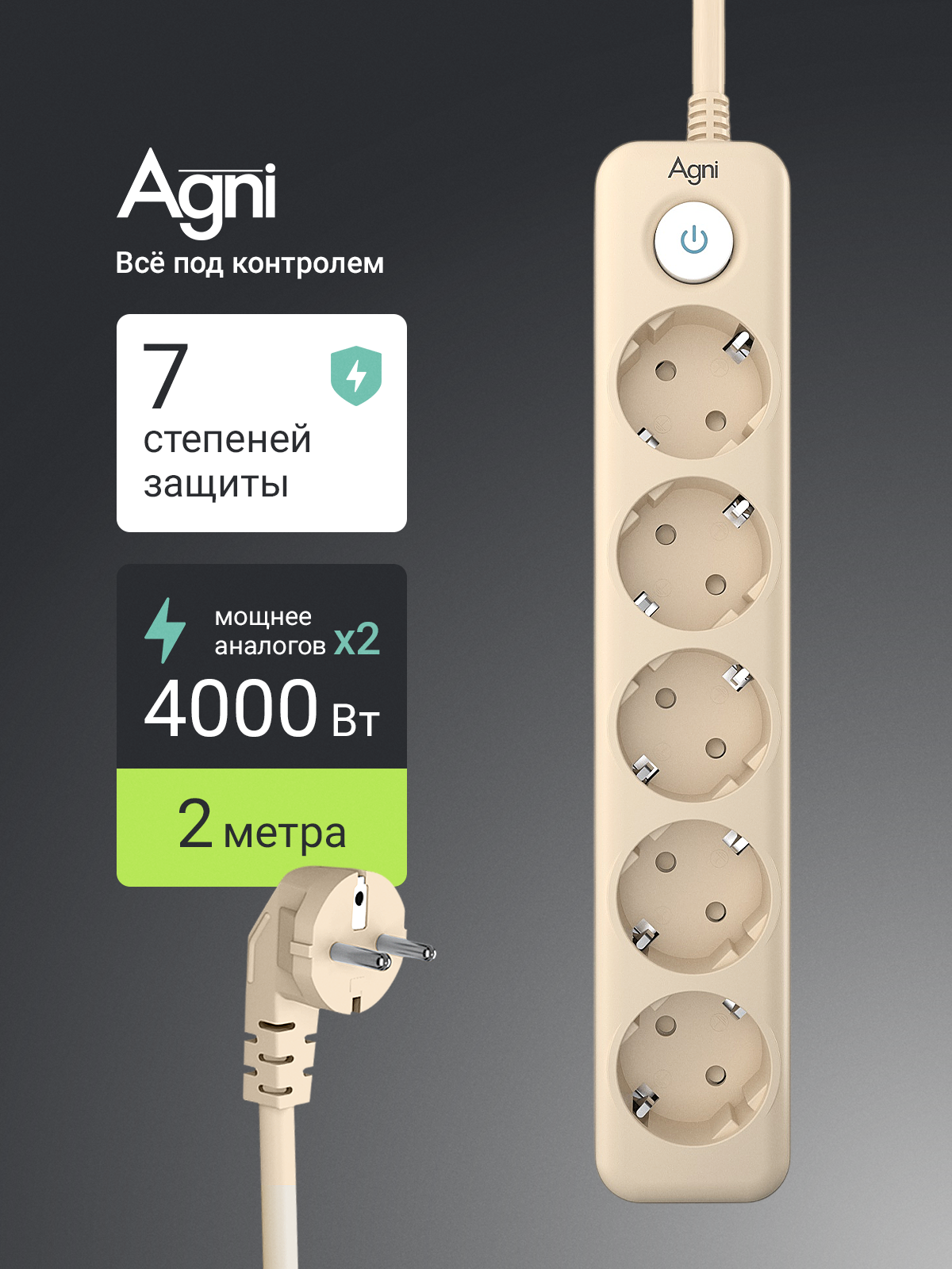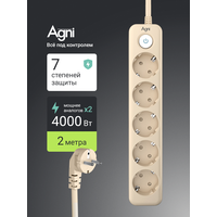 Сетевой фильтр с заземлением на 5 розеток AGNI с выключателем, защитные шторки, 4000 Вт/16 А, удлинитель 2 метра: сравнение цен, характеристики, фото, актуальное наличие и цены.