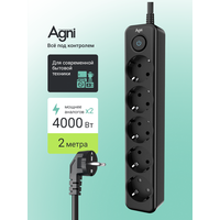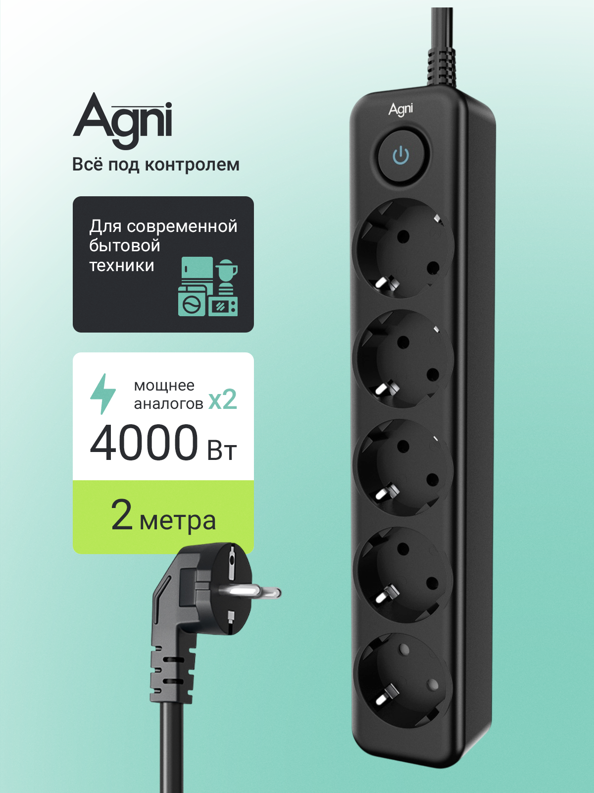 Сетевой фильтр с заземлением на 5 розеток AGNI с выключателем, защитные шторки, 4000 Вт/16 А, удлинитель 2 метра: сравнение цен, характеристики, фото, актуальное наличие и цены.