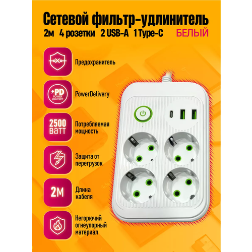 Сетевой фильтр удлинитель оснащен четырьмя розетками, что обеспечивает возможность подключения сразу четырех устройств. Длина кабеля составляет 2 метра, что позволяет удобно расположить устройства на рабочем столе или на полу.