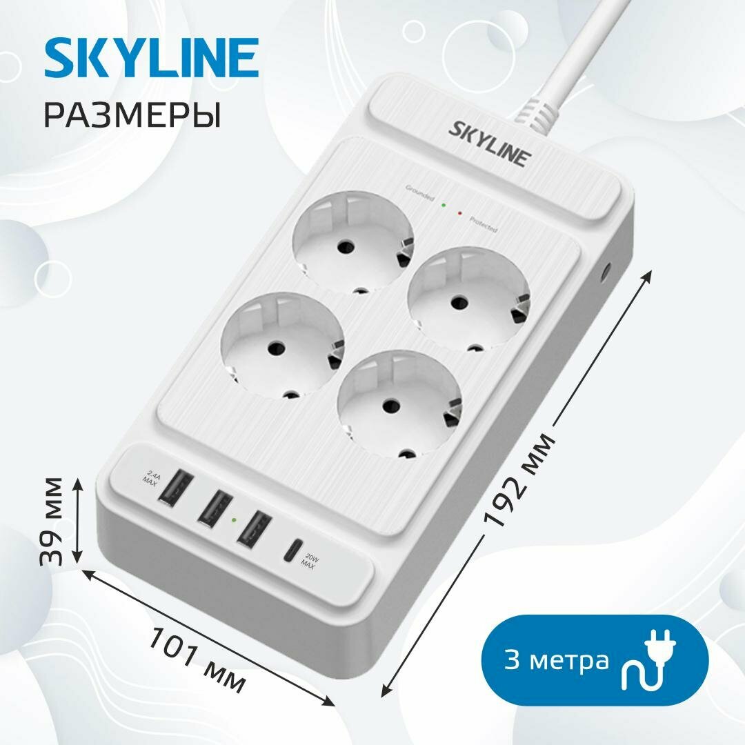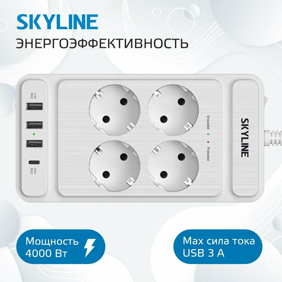 Сетевой фильтр SKYLINE USP-430, 4 розетки, 3 USB + 1 type-C, power delivery, кабель 3 метра, 4000 Вт, 16А, белый