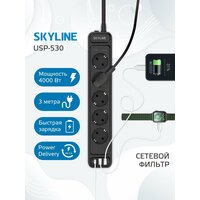 Купить Сетевой фильтр SKYLINE USP-530, 5 розеток, 2 USB + 1 type-C, power delivery, кабель 3 метра, 4000 Вт, 16А, черный с доставкой по всей России.