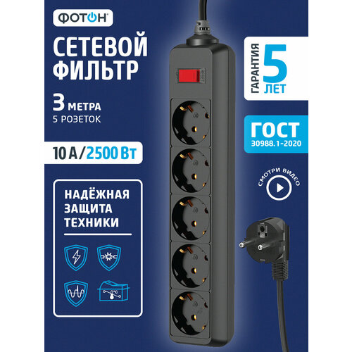Купить Сетевой фильтр удлинитель фотон 10А 3 метра 5 розеток с выключателем с заземлением черный, ГОСТ с доставкой по всей России. Сетевой фильтр удлинитель фотон 10А 3 метра 5 розеток с выключателем с заземлением черный, ГОСТ: сравнение цен, характеристики, фото, актуальное наличие и цены.