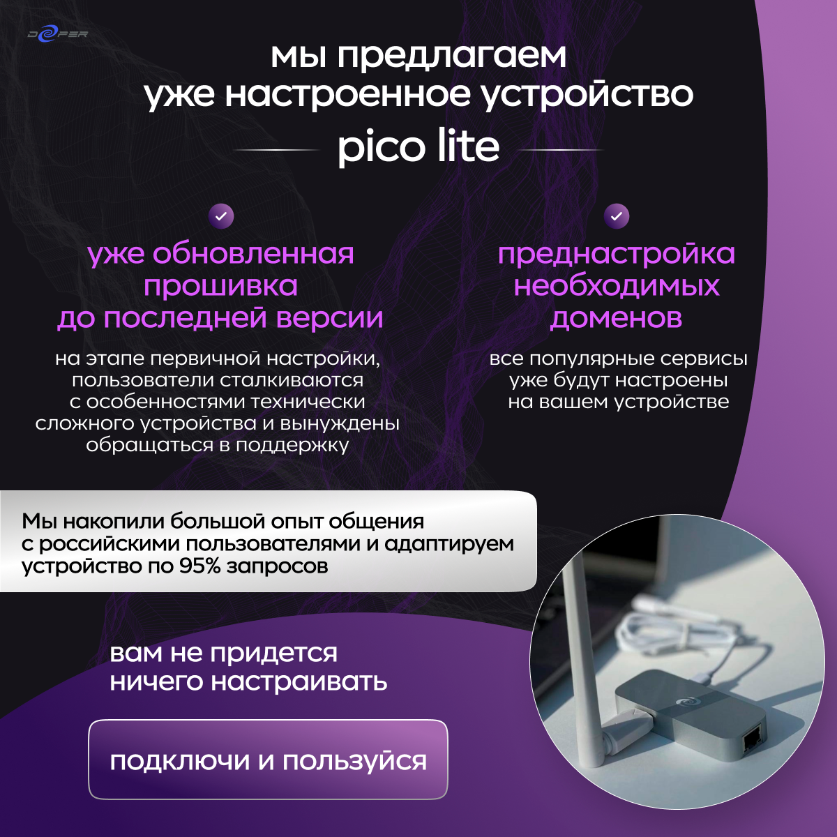 Откройте мир безопасного интернета с нашим уникальным маршрутизатором Deeper connect Pico Lite. С маршрутизатором Deeper connect Pico Lite вы получаете доступ к надежному соединению с быстрой и удобной настройкой. Эта модель подойдет для путешествий, кафе, для дома и офиса. Устройство устанавливается между кабелем провайдера (витая пара) и вашим обычным роутером как промежуточное звено.