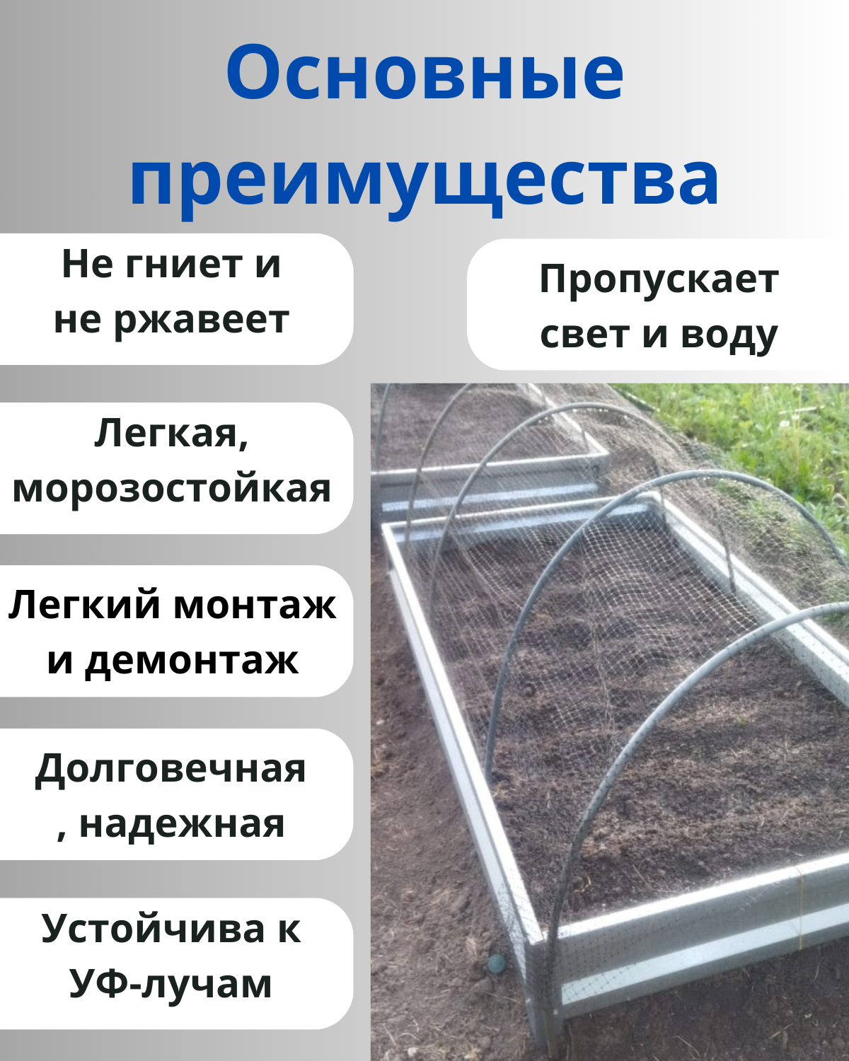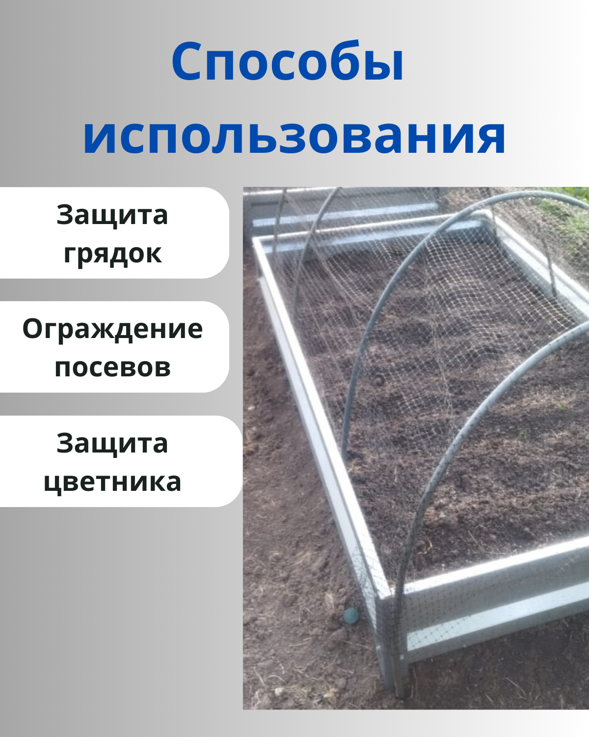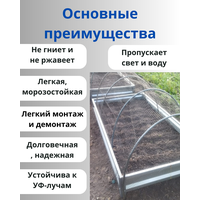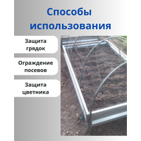 Пластиковая сетка с размером ячейки 13 х 15 мм предназначена для защиты посадок от раскапывания кошками, собаками и прочими мелкими животными. Особенности защитной сетки: лёгкая, прочная; не теряет свойств при плотном хранении и транспортировке; не гниёт, не ржавеет; не накаляется на солнце; возможна многоразовое использование. пропускает свет и воду. Применение: сетка укладывается непосредственно на грядку или цветник; можно растянуть ее на дуги, если посадки высокие и закрепить скрепками; рекомендуется фиксировать скобами в земле.