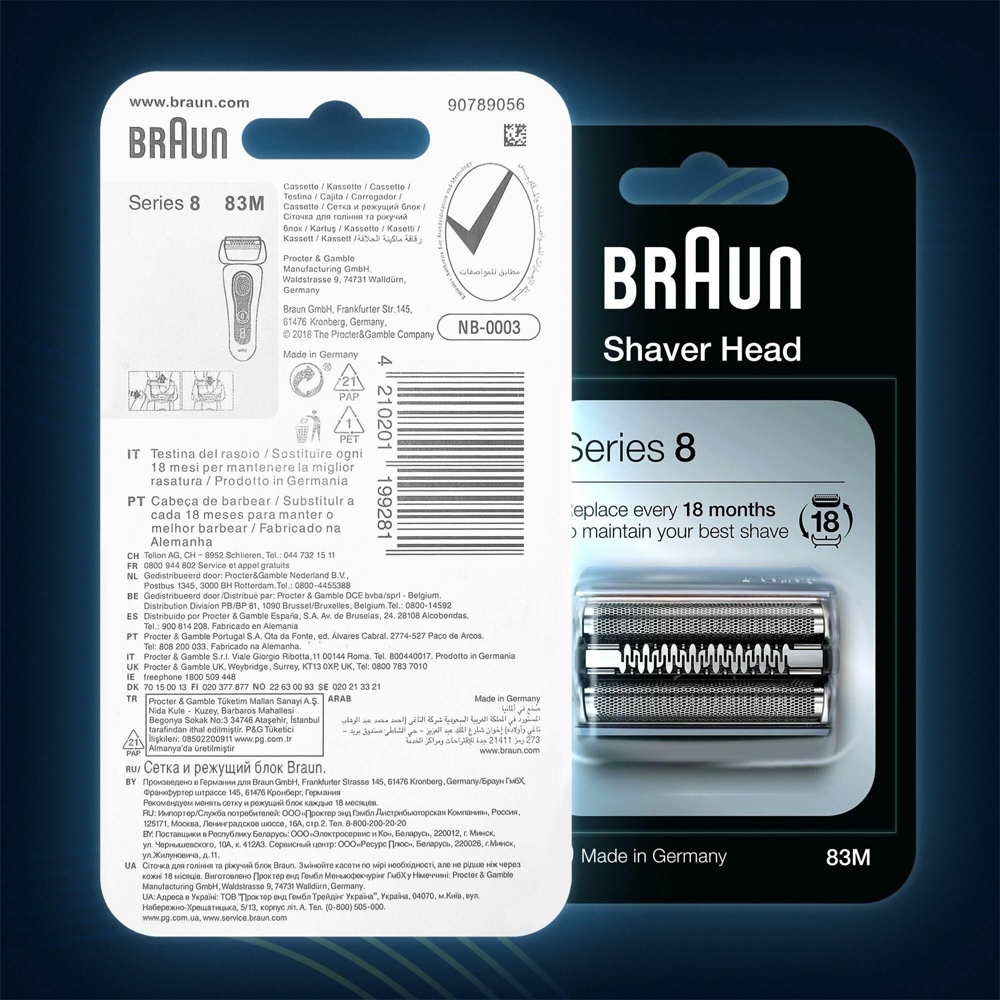 Сменная насадка для электробритв Braun 8 поколения - Мощность в каждом движении с заботой о коже. Верните 100% эффективность вашей электробритвы Braun 9 Серии с помощью аксессуара – сменной насадки Braun 83M с 4 идеально синхронными бреющими элементами и защитой кожи ежедневно. В процессе использования, где каждые 18 месяцев ваша бритва справляется с 6 миллионами волосков, режущие элементы неизбежно изнашиваются, делая процесс бритья менее эффективным и комфортным. Поэтому Braun рекомендует обновлять бреющую сетку и режущий блок каждые полтора года, чтобы обеспечить максимальное удовольствие, комфорт и эффективность от каждой процедуры бритья. Насадка заменяется легким движением в 1 клик.