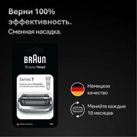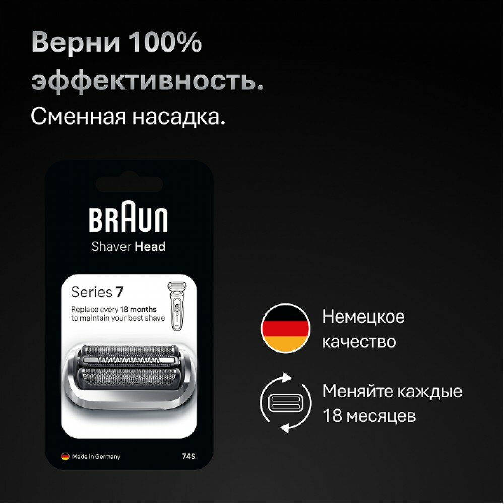 Сменная насадка для электробритв Braun 7 поколения - для Комфортного и эффективного бритья ежедневно. Верните 100% эффективность вашей электробритвы Braun 7 Серии с помощью аксессуара – сменной насадки Braun 74s с 3 подвижными лезвиями, которые адаптируются к любым контурам лица, и защитой кожи ежедневно. В процессе использования, где каждые 18 месяцев ваша бритва справляется с 6 миллионами волосков, режущие элементы неизбежно изнашиваются, делая процесс бритья менее эффективным и комфортным. Поэтому Braun рекомендует обновлять бреющую сетку и режущий блок каждые полтора года, чтобы обеспечить максимальное удовольствие, комфорт и эффективность от каждой процедуры бритья. Насадка заменяется легким движением в 1 клик.