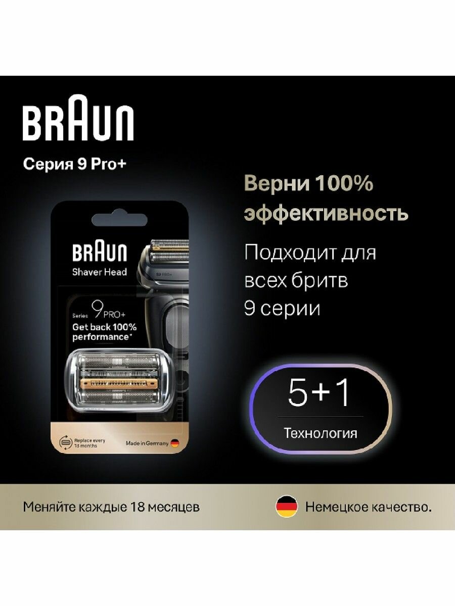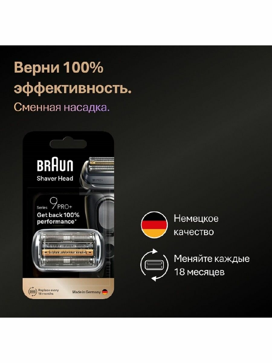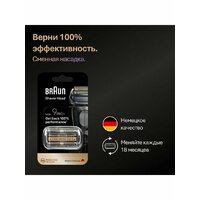 Сменная насадка для электробритв Braun 9 поколения - Идеальный результат одним движением. Верните 100% эффективность вашей электробритвы Braun 9 Серии с помощью аксессуара – сменной насадки Braun 96M с 5 идеально синхронными бреющими элементами и защитой кожи ежедневно. В процессе использования, где каждые 18 месяцев ваша бритва справляется с 6 миллионами волосков, режущие элементы неизбежно изнашиваются, делая процесс бритья менее эффективным и комфортным. Поэтому Braun рекомендует обновлять бреющую сетку и режущий блок каждые полтора года, чтобы обеспечить максимальное удовольствие, комфорт и эффективность от каждой процедуры бритья. Насадка заменяется легким движением в 1 клик.