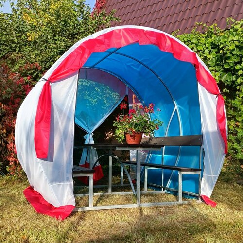 Преимущества москитной сетки для беседки Пион: 1. Надежная система крепления сетки от комаров к каркасу. 2. Просторные входные двери с обоих торцов обеспечивают удобный доступ и лёгкое проветривание внутреннего пространства. 3. Торцевые ламбрекены позволяют создать легкое затенение в солнечную погоду. 4. Полотно верхней части изделия защищает от прямого попадания солнечных лучей, тем самым продлевая срок службы сотового поликарбоната. 5. Самомоющаяся москитная сетка двойного плетения обеспечивает полную защиту от всех видов летающих насекомых. 6. Высококачественные материалы, используемые при изготовлении изделия, позволяют сохранять эстетичный внешний вид долгие годы. 7. Данный вид сетки применяется для конструкций беседок с габаритными размерами, не превышающими значения указанные на фото-чертёже.