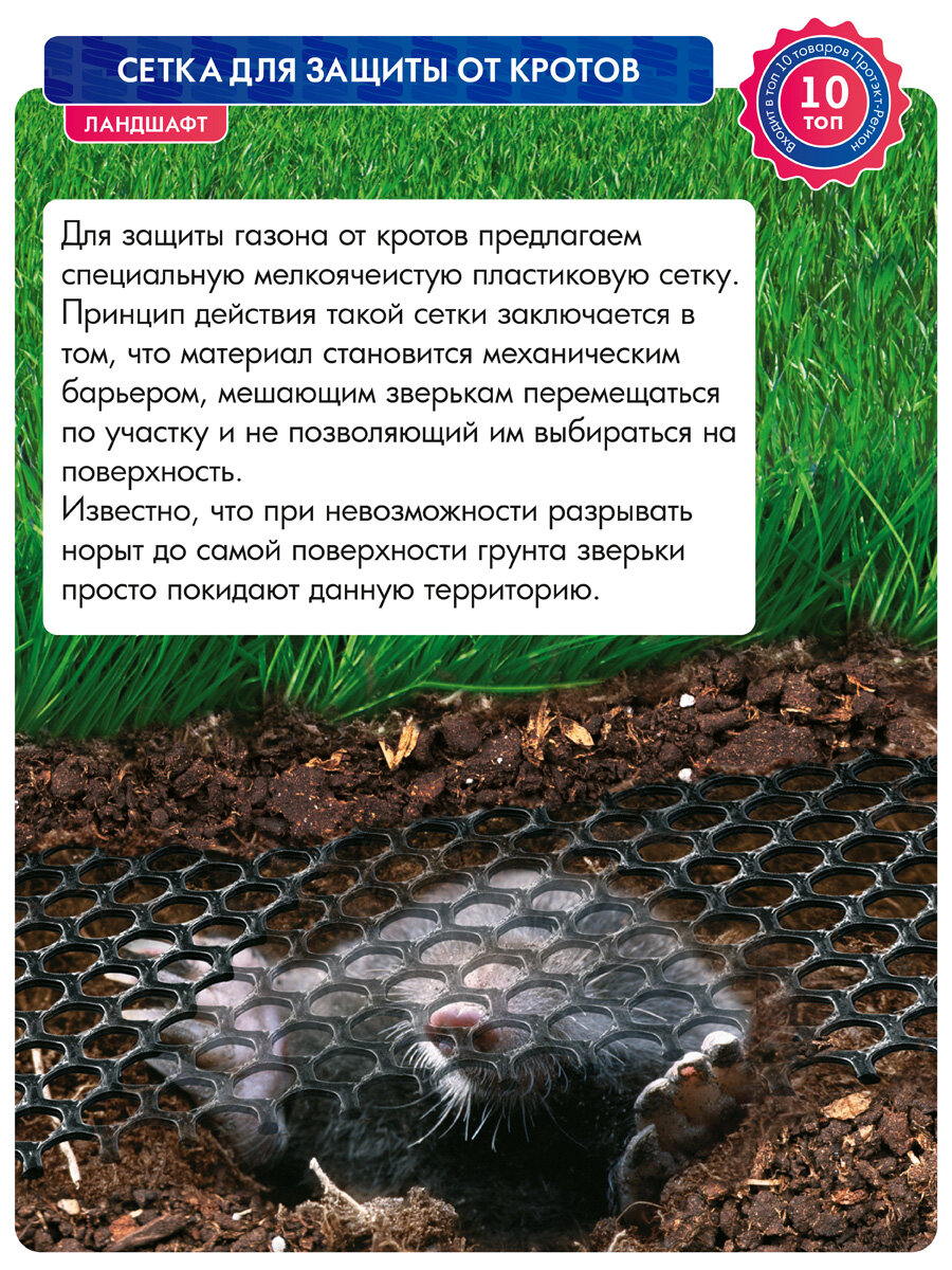 Средство от кротов в саду представляет собой сплошное полотно из прочного пластика. Ячеистая структура не ограничивает доступ воздуха к растениям, но купирует передвижение вредителей за счет маленького размера ячеек. Кроме землероек сетка от крота помогает защитить посадки от других грызунов.