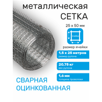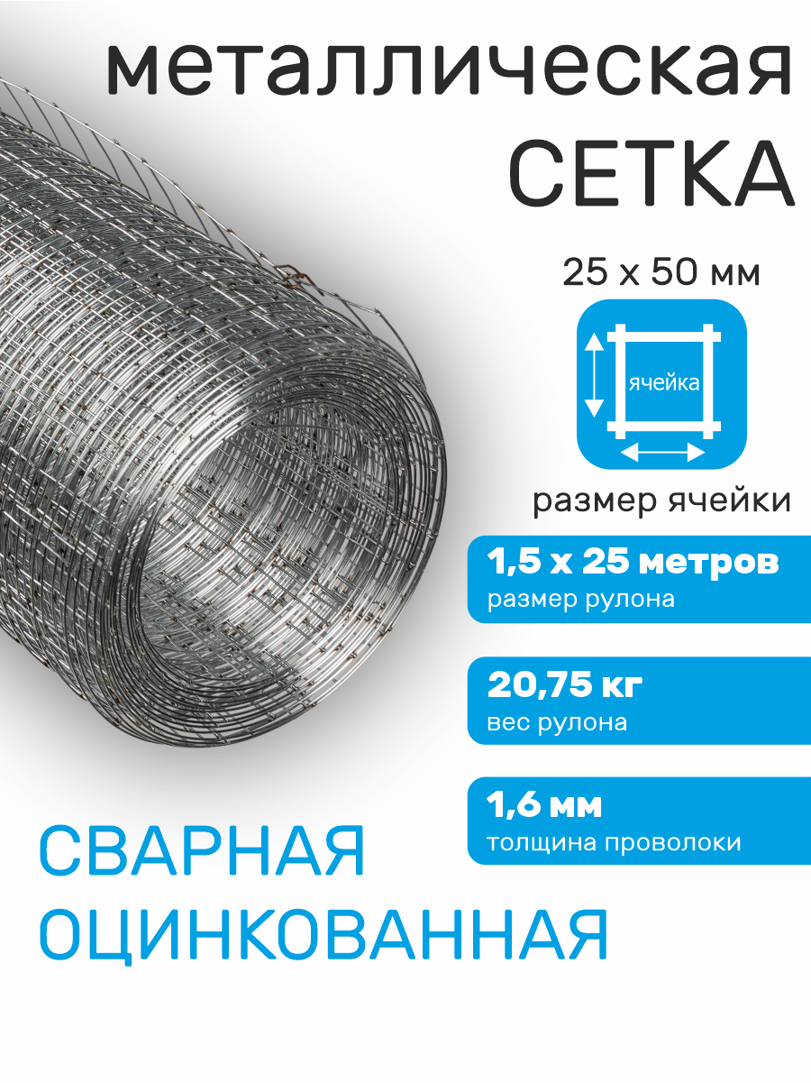 Сетка оцинкованная сварная заборная строительная ячейка 25 х 50 мм d=1,6 мм (рулон 1,5 х 25 м): сравнение цен, характеристики, фото, актуальное наличие и цены.
