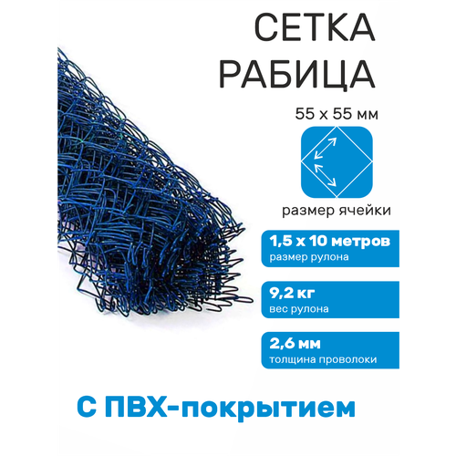 Купить Сетка рабица с ПВХ покрытием ячейка 55 х 55 d=2,6 мм синяя (рулон 1,5 х 10 м) с доставкой по всей России. Сетка рабица с ПВХ покрытием ячейка 55 х 55 d=2,6 мм синяя (рулон 1,5 х 10 м): сравнение цен, характеристики, фото, актуальное наличие и цены.