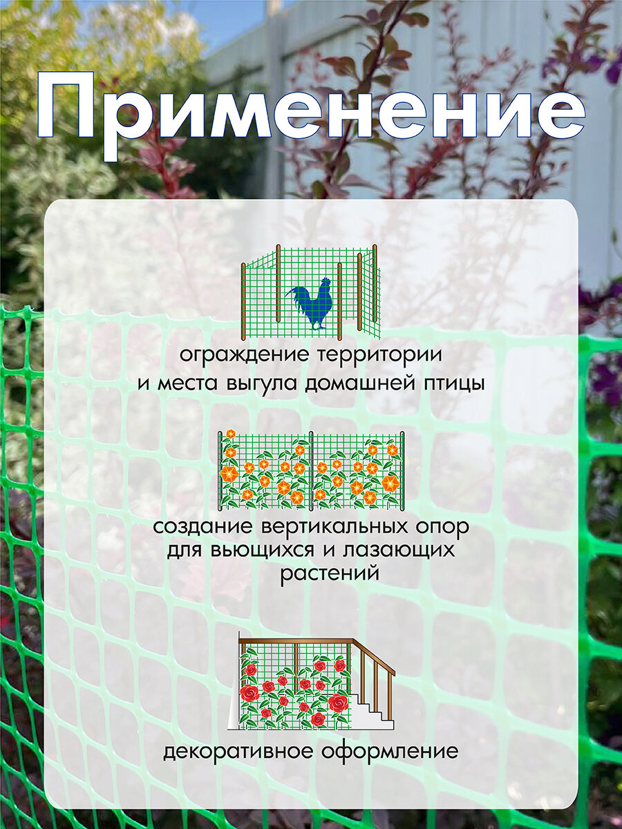 Сетка идеально подходит для поддержки растений. Декоративная сетка также подходит для создания шпалер и опор для клематисов и плетистых роз. Ее можно использовать как держатель для кустов, что поможет сохранить порядок в вашем саду и защитить растения от ветра. Благодаря прочному пластику, изделие устойчиво к воздействию внешней среды, что делает его идеальным для долгосрочного использования.