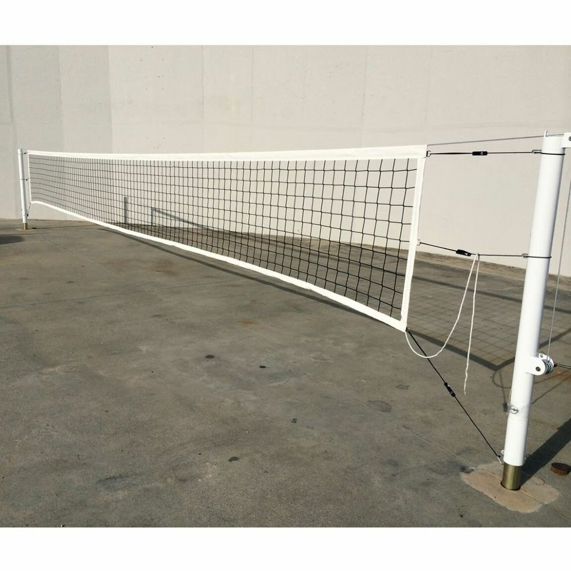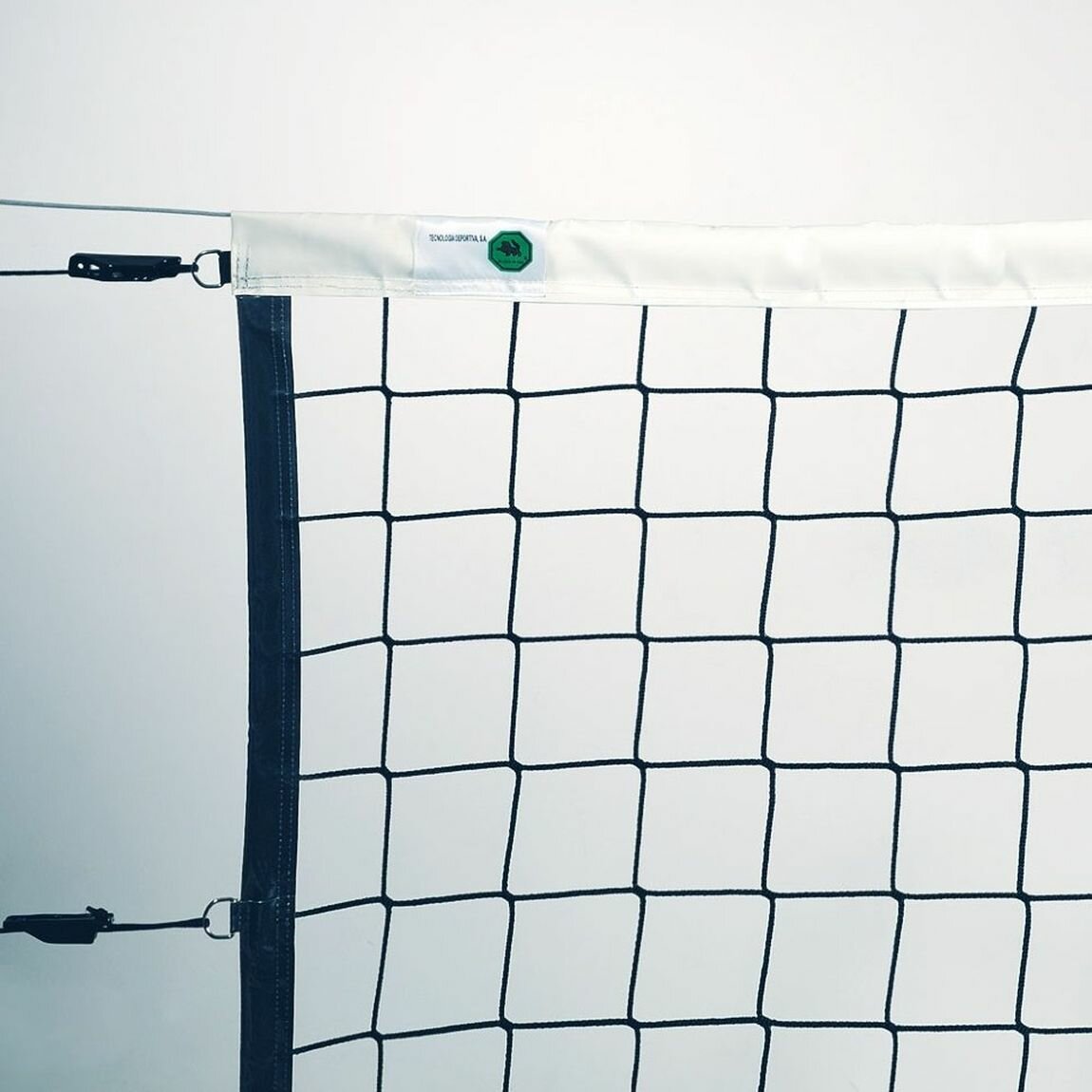Сетка волейбольная профессиональная "EL LEON DE ORO" арт. 14443035002. Официальная сетка Федерации волейбола Испании. Произведена по безузловой технологии, ячейка - четырехугольная, стандартная 10х10 см. Нить 4,0 мм полипропилен, стойкий к агрессивным атмосферным воздействиям и с защитой от ультрафиолета. Стандартные размеры: длина 9.50 м, ширина 1.00 м. Верх сетки окантован белой лентой шириной 70 мм из прочного, износостойкого ПВХ, таким же образом обработан и низ и боковые стороны сетки, но лента, в соответствии с правилами, шириной 50 мм. Сетка поставляется со стальным тросом в оболочке из ПВХ длиной 11,70 м. У сетки 6 шнуров для натяжения, по три с каждой стороны, на каждом шнуре пластиковый блок-натяжитель, есть боковые вставки из фибергласовых стержней для идеально ровного натяжения сетки. Цвет черный.
