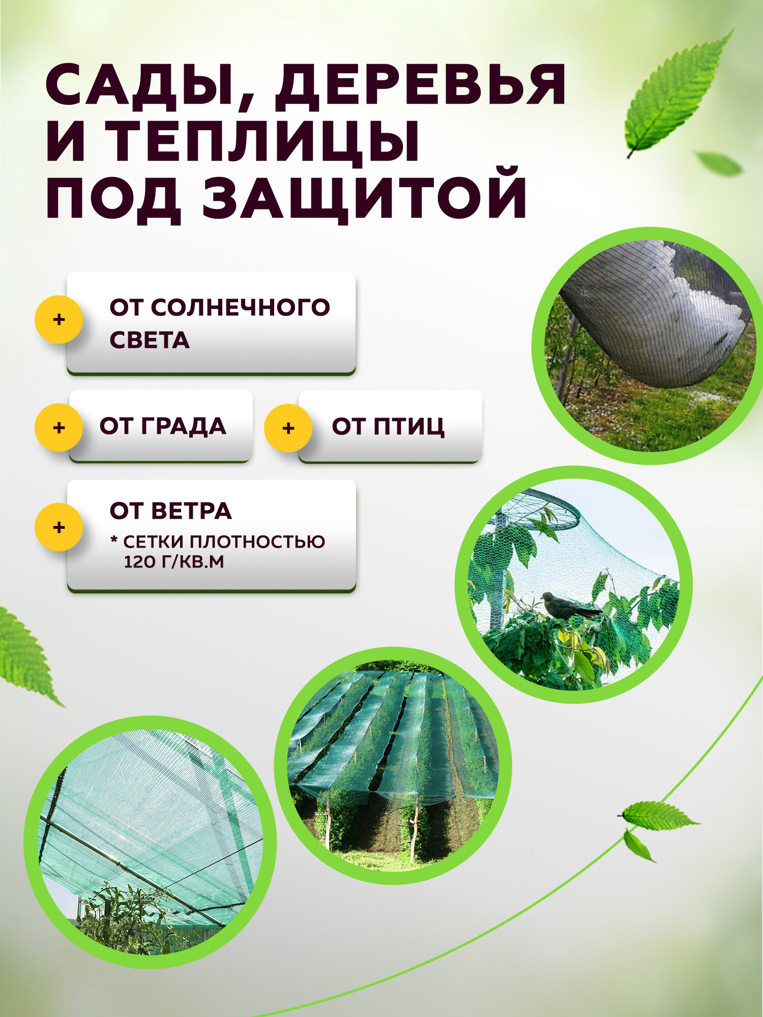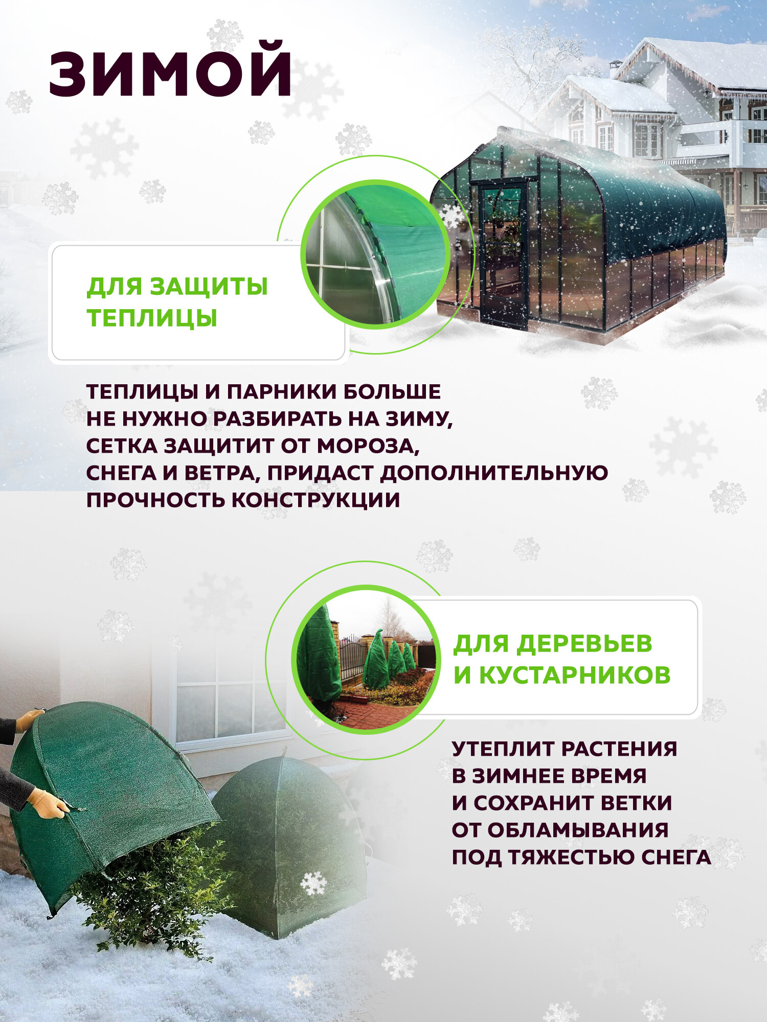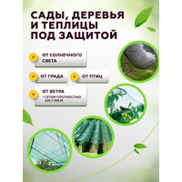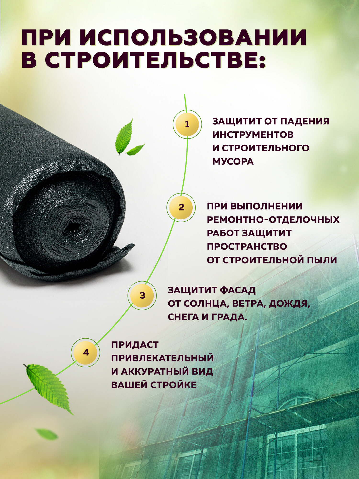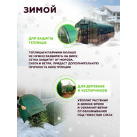 Сетка затеняющая 35 г/кв. м, 3х15 м универсальнаяпроцент затенения - 40%, светостабилизированная, размер ячейки 3х8 мм; защищает теплицы, сады, деревья от избыточного света, птиц, града; при использовании на теплицах сетка отражает солнечный свет и равномерно рассеивает его по всему парнику, таким образом оптимизирует внутренние микроклиматические условия даже в круглогодичной теплице, сглаживая разницу дневной и ночной температур; уменьшает испарение влаги, что особенно удобно при ограниченном поливе; сетка защищает растения от солнечных ожогов и появления плесени; предотвращает падение инструментов и строительного мусора при выполнении высотных работ; защищает пространство вокруг места выполнения ремонтно-отделочных работ от строительной пыли: защитный экран из мелкоячеистой сетки не пропускает ремонтную пыль; защищает фасад от атмосферных явлений в период его ремонта или реставрации; маскирует реставрируемые части фасада здания при проведении работ в городской черте; прочность и простота монтажа позволяют использовать сетку многократно; сетка имеет по периметру отверстия для быстрого и качественного монтажа, что дает возможность легко соединять между собой полотна сетки и крепить их с помощью пластиковых зажимов и стяжек к строительным лесам.