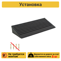 Съезд с бордюра резина СР-100-1 основная часть — это формовое изделие из резины черного цвета. Изделие имеет на верхней части рифление для предотвращения проскальзывания колес, изделие устойчиво за счет своей массы и отверстия для крепежа не предусмотрены.