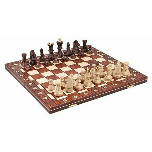 Амбассадор" — подарочный шахматный набор большого размера (более половины метра). Доска и фигуры деревянные, вручную украшены многочисленными выжиганиями. Резные фигуры сделаны из цельной древесины (бук). Вручную украшены методом художественного выжигания по дереву, покрыты матовым лаком, благодаря чему не бликуют. Основание фигур покрыто войлоком зелёного цвета. Доска складная, деревянная, вручную украшена многочисленными выжиганиями, внутри — ячейки для хранения фигур — для каждой фигуры отдельная ячейка. Сбоку доски два железных замочка, которые предотвращают её произвольное раскрытие. Со всех сторон от игрового поля, на доску вручную нанесена шахматная нотация методом декоративного выжигания. Размер клеток соответствует стандартам фиде. Подходит как для подарка, так и для личного повседневного использования. Могут использоваться как элемент декора интерьера. Размер в разложенном виде — 52x52 см в сложенном — 52x25,2 см. Король: основание 3,8 см; высота 10.7 см Ферзь: основание 3,8 см; высота 9 см Слон: основание 3,8 см; высота 7,5 см Конь: основание 3,8 см; высота 7,2 см Ладья: основание 3,8 см; высота 6 см Пешка: основание 3,1 см; высота 5 см Сделано в Европе (Польша). Ручная работа.
