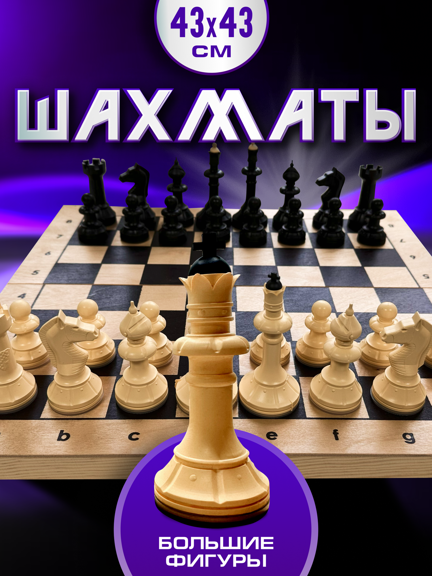 В комплект входит шахматная деревянная доска размером 43х43 см. Её изготовление прошло с особым вниманием к деталям и качеству.